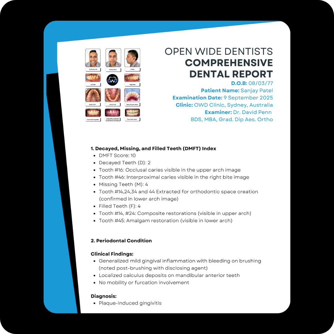 Once images are submitted, registered dentists at OWD review them and generate a written report. This includes: